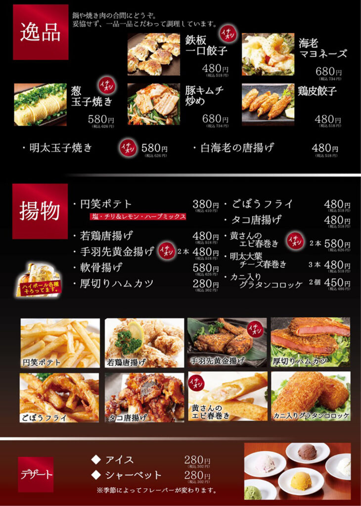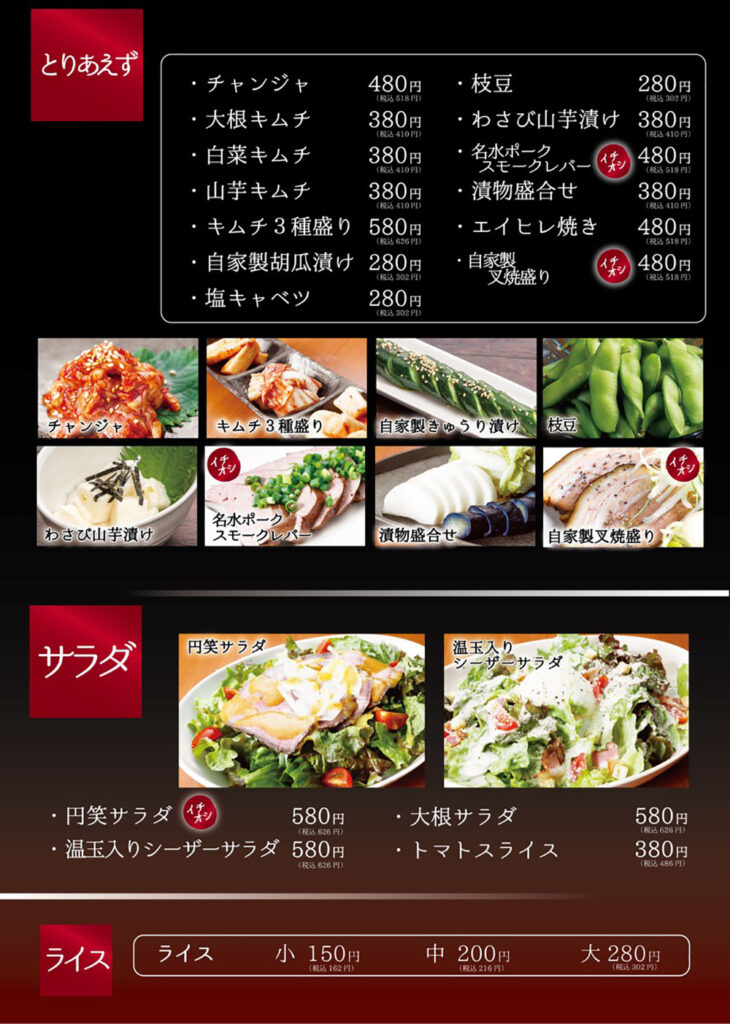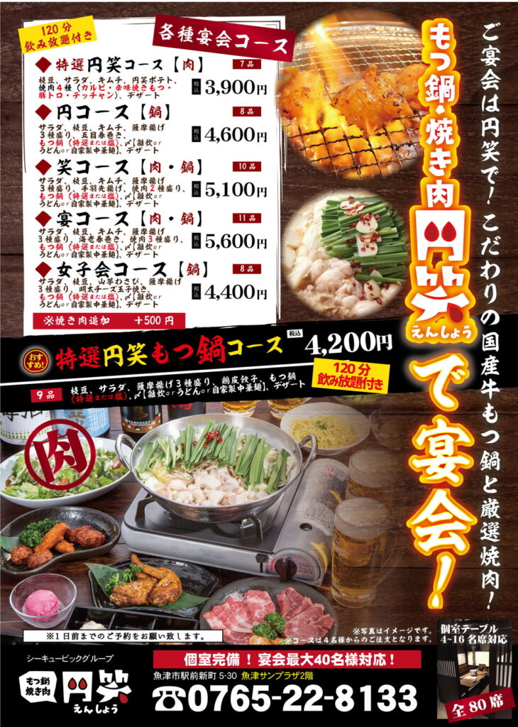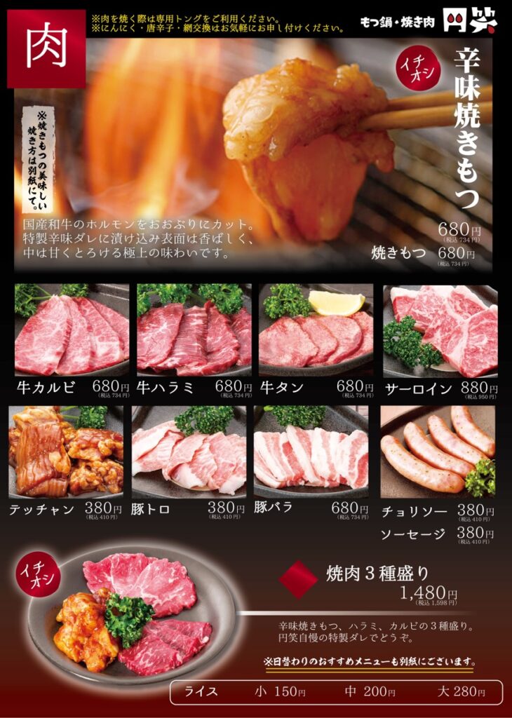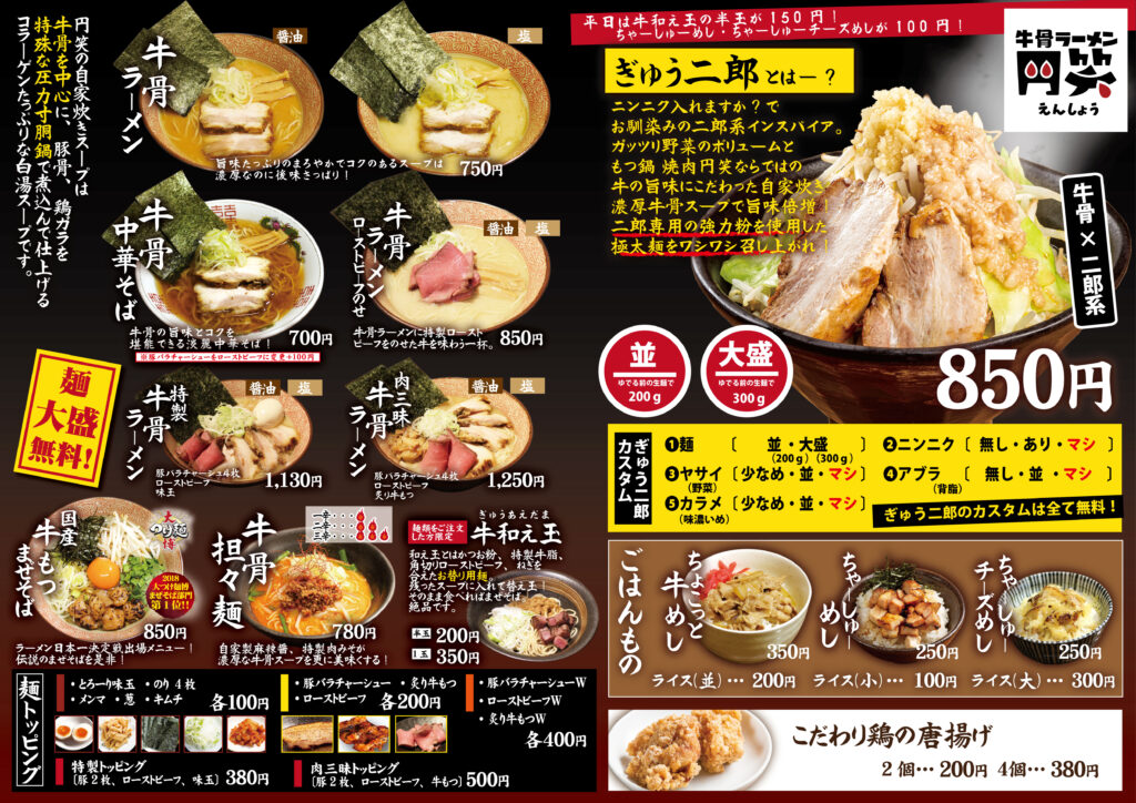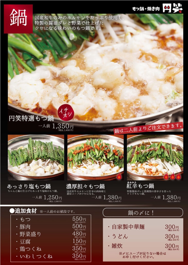 | 営業時間 | [牛骨ラーメン 円笑] 11:00~15:00 [もつ鍋焼き肉円笑] 17:30~22:00 |